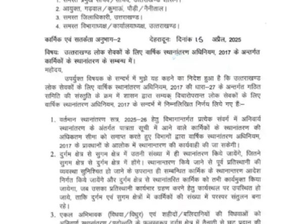 उत्तराखण्ड लोक सेवकों के लिए वार्षिक स्थानांतरण अधिनियम, 2017 के अन्तर्गत कार्मिकों के स्थानांतरण के सम्बन्ध में