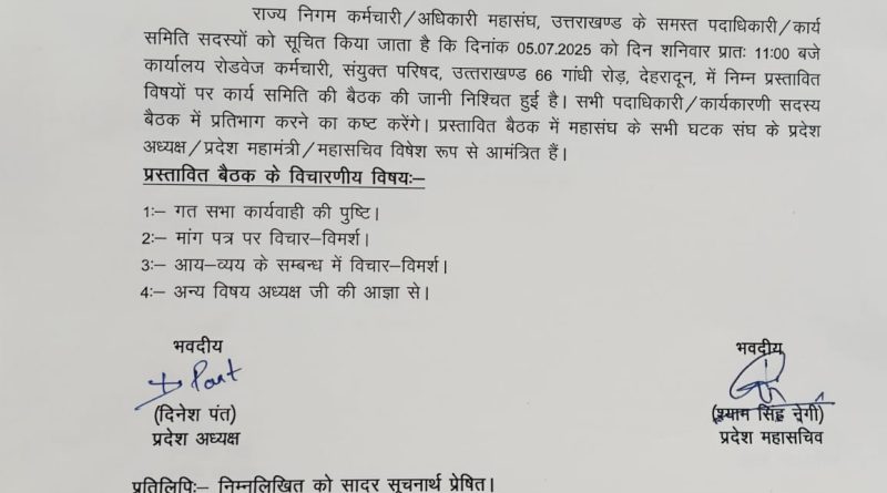 Read Moreकार्य समिति बैठक सूचना राज्य निगम कर्मचारी/अधिकारी महासंघ, उत्तराखण्ड के समस्त पदाधिकारी/कार्य समिति सदस्यों को सूचित किया जाता है कि