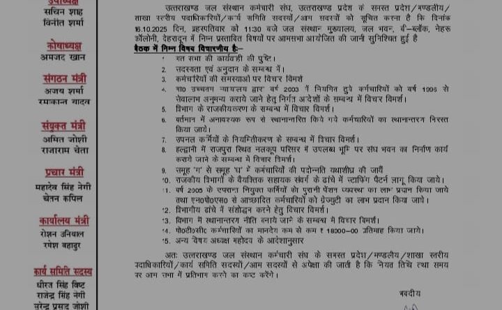 Read Moreआम सभा सूचना दिनांक 28-09-2025 उत्तराखण्ड जल संस्थान कर्मचारी संघ, उत्तराखण्ड प्रदेश के समस्त प्रदेश/मण्डलीय /साखा स्तरीय पदाधिकारियों/कर्म समिति सदस्यों/तम