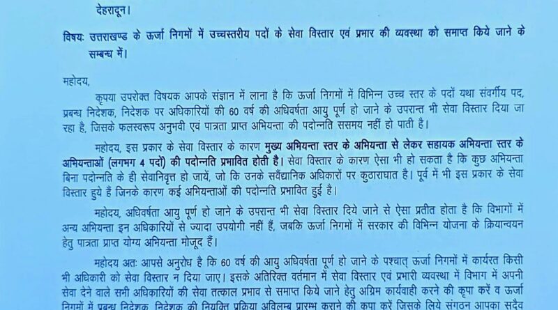 उत्तरांचल पॉवर इंजीनीयर्स एसोसिएशन ने उत्तराखण्ड के ऊर्जा निगमों में उच्चस्तरीय पदों के सेवा विस्तार एवं प्रभार की व्यवस्था को समाप्त किये जाने के सम्बन्ध में मुख्यमंत्री धामी को लिखा पत्र