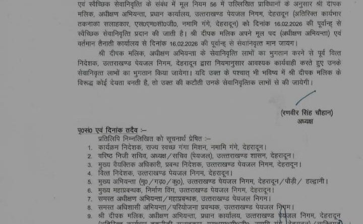 Read Moreएतद द्वारा पेयजल एवं स्वच्छता अनुभाग-1, उत्तराखण्ड शासन के पत्र संख्या 152/उन्नीस (1)/2026-(33 अधि०)/2003, दिनांक 12 फरवरी, 2026 के अनुपालन