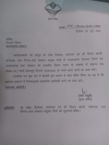 अधोहस्ताक्षरी को प्रस्तुत श्री रमेश विंजोला, संयोजक एवं श्री विजय खाली, संयोजक, जल निगम-जल संस्थान संयुक्त मोर्चा के उत्तराखण्ड पेयजल निगम एवं उत्तराखण्ड जल संस्थान को राजकीय विभाग बनाने के सम्बन्ध में संलग्न पत्र संख्या-37/मोर्चा देहरादून दिनांक 18.06.2024 का संदर्भ ग्रहण करने का कष्ट करें।
