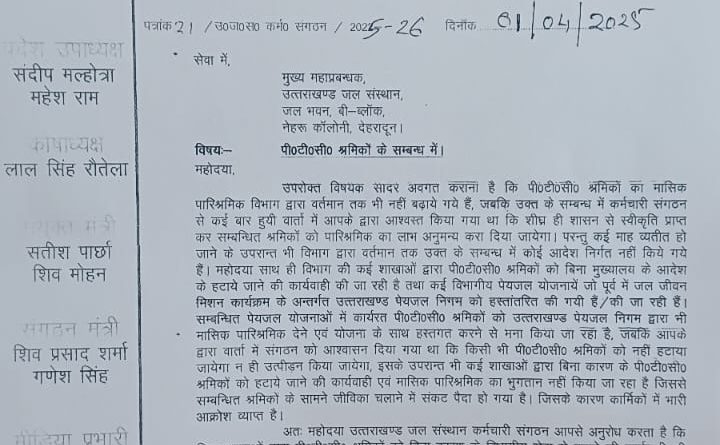 उपरोक्त विषयक सादर अवगत कराना है कि पी०टी०सी० श्रमिकों का मासिक पारिश्रमिक विभाग द्वारा वर्तमान तक भी नहीं बढ़ाये गये हैं, जबकि उक्त के सम्बन्ध में कर्मचारी संगठन से कई बार हुयी वार्ता में आपके द्वारा आश्वस्त किया गया था कि शीघ्र ही शासन से स्वीकृति प्राप्त कर सम्बन्धित श्रमिकों को पारिश्रमिक का लाभ अनुमन्य करा दिया जायेगा। परन्तु कई माह व्यतीत हो जाने के उपरान्त भी विभाग द्वारा वर्तमान तक उक्त के राम्बन्ध में कोई आदेश निर्गत नहीं किये गये है। महोदया साथ ही विभाग की कई शाखाओं द्वारा पी०टी०सी० श्रमिकों को बिना मुख्यालय के आदेश के हटाये जाने की कार्यवाही की जा रही है तथा कई विभागीय पेयजल योजनायें जो पूर्व में जल जीवन मिशन कार्यक्रम के अन्तर्गत उत्तराखण्ड पेयजल निगम को हस्तांतरित की गयी है/की जा रही हैं। सम्बन्धित पेयजल योजनाओं में कार्यरत पी०टी०सी० श्रमिकों को उत्तराखण्ड पेयजल निगम द्वारा भी नासिक पारिश्रमिक देने एवं योजना के साथ हस्तगत करने से मना किया जा रही है, जबकि आपके द्वारा वार्ता में संगठन को आश्वासन दिया गया था कि किसी भी पी०टी०सी० श्रमिकों को नहीं हटाया जायेगा न ही उत्पीडन किया जायेगा, इसके उपरान्त भी कई शाखाओं द्वारा बिना कारण के पी०टी०सी० श्रमिकों को हटाये जाने की कार्यवाही एवं मासिक पारिश्रमिक का भुगतान नहीं किया जा रहा है जिससे सम्बन्धित श्रमिकों के सामने जीविका चलाने में संकट पैदा हो गया है। जिसके कारण कार्मिकों में भारी आक्रोश व्याप्त है।