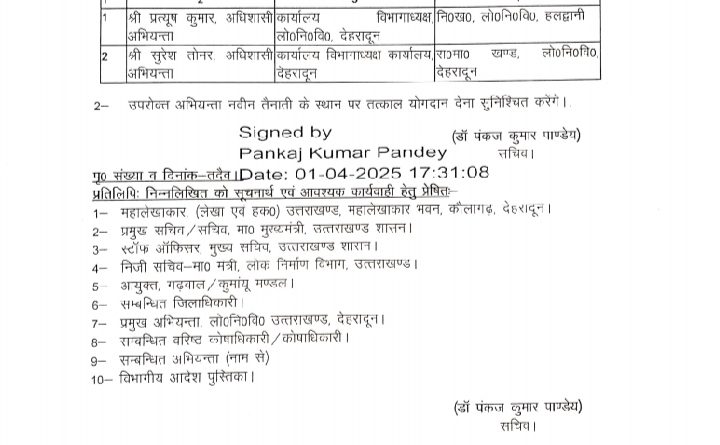 उत्तराखंड उत्तराखंड शासन ने अधिशासी और सहायक अभियंताओं के कार्यक्षेत्र में किया फेरबदल April 1, 2025 Crime Uttarakhand देहरादून।। उत्तराखंड शासन ने लोक निर्माण विभाग में अधिशासी और सहायक अभियंताओं के कार्यक्षेत्र में किया फेरबदल देखिए लिस्ट