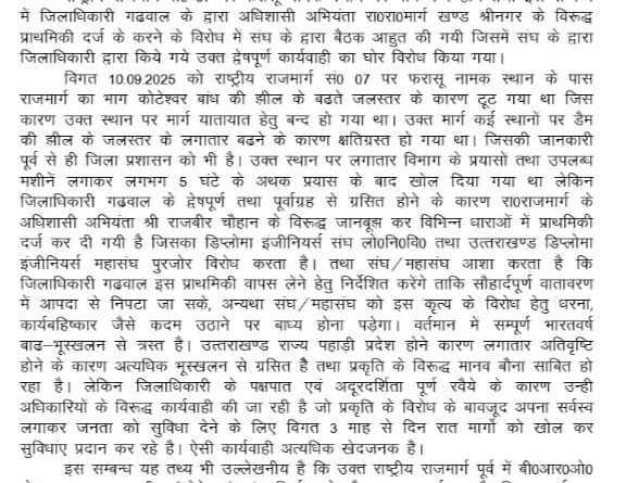 उत्तराखण्ड डिप्लोमा इंजीनियर्स संघ लो०नि०वि० तथा उत्तराखण्ड डिप्लोमा इंजीनियर्स महासंघ के द्वारा अधिशासी अभियंता राष्ट्रीय राजमार्ग खण्ड श्रीनगर के विरूद्ध जिलाधिकारी गढवाल के द्वारा बिना कारण द्वेषपूर्ण कार्यवाही प्राथमिकी दर्ज करने का पुरजोर विरोध, प्राथमिकी वापस न लेने पर हो सकता है कार्य बहिष्कार।