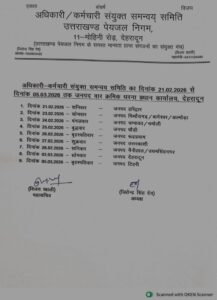 2. दिनांक 21.02.2026 से दिनांक 05.03.2026 तक जनपदवार कार्मिकों द्वारा घरना/प्रदर्शन क्रमबद्ध प्रधान कार्यालय, उत्तराखण्ड पेयजल निगम, 11-मोहिनी रोड़, देहरादून में दिया जायेगा।
