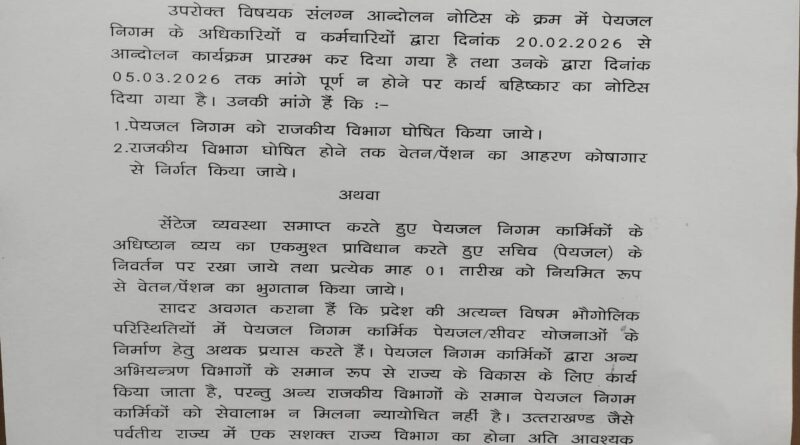 उपरोक्त विषयक संलग्न आन्दोलन नोटिस के क्रम में पेयजल निगम के अधिकारियों व कर्मचारियों द्वारा दिनांक 20.02.2026 से आन्दोलन कार्यक्रम प्रारम्भ कर दिया गया है तथा उनके द्वारा दिनांक 05.03.2026 तक मांगे पूर्ण न होने पर कार्य बहिष्कार का नोटिस दिया गया है। उनकी मांगे हैं कि :-