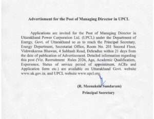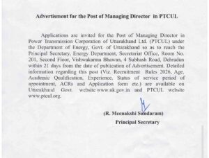 उत्तराखंड ऊर्जा निगमों के तीनों MD की पोस्ट का advertisement निकला April 2, 2026 Crime Uttarakhand ऊर्जा निगमों के तीनों MD की पोस्ट का advertisement निकला