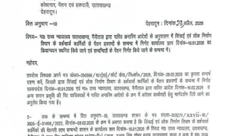 देहरादून।उत्तराखंड में 16 जनवरी 2026 के शासनादेश से प्रभावित हजारों वर्क चार्ज कर्मचारियों के लिए राहत भरी खबर सामने आई है। सिंचाई एवं लोक निर्माण विभाग के कई सेवानिवृत्त कर्मचारियों की रोकी गई पेंशन अब फिर से बहाल कर दी गई है।